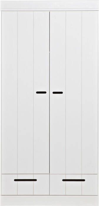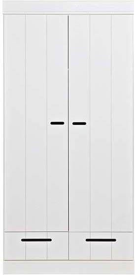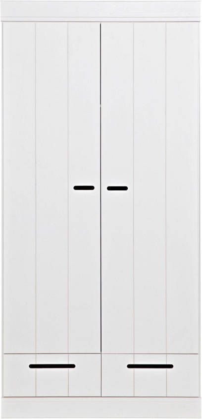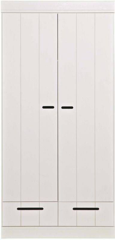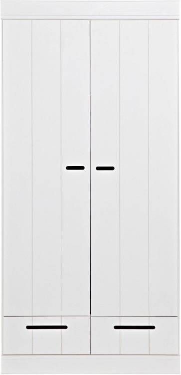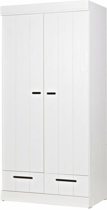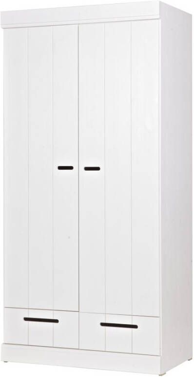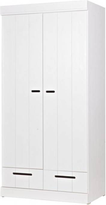 2 deurs kledingkast./h3#Deze 2 deurs kledingkast Connect van Woood is gemaakt van grenen en afgelakt met een witte verf. De deuren van de kast bestaan uit stroken en de uitsparing in het midden van de deuren dient als handvat. De kledingkast geeft een roede met daarboven een legplank. Onder de deuren bevinden zich 2 laden. Wil je extra opbergruimte? Je kunt de kast uitbreiden met een legplanken set. Hierin wordt een tussenschot en 2 legplanken geleverd. Bestel hiervoor het artikelnummer 105549. Deze kledingkasten kunnen heel goed gecombineerd worden door ze tegen elkaar aan te zetten waardoor je zelf een kastenwand creëert. Bekijk de gehele serie eens en stel je eigen kastenwand samen. Tip! Je kunt de kast zelf ook in een leuk kleurtje verven! Kenmerken Zelfbouw pakket met eenvoudige montage instructie Maak met meerdere kasten uit de Connect serie een kastenwand. Afmeting 195x94x53 cm (hxbxd) Hollands design in je slaapkamer Woood is een oer Hollands merk dat bekend staat om haar hoofdzakelijk massief houten collecties van FSC grenen en eiken. Dit geeft de collecties een stoere landelijke uitstraling. De Connect kledingkast zijn zeer geschikt om een grote kastenwand van te maken door meerdere 2 of 3 deurs naast elkaar te zetten. Het onderhoud Je wilt natuurlijk dat je nieuwe kast zolang mogelijk mee gaat. Zet de kast daarom altijd volgens de bijgeleverde instructies in elkaar zodat deze stevig staat. Om het kast fris en stofvrij te houden is het geen probleem om deze af te nemen met een vochtige doek. De levering Uiteraard brengen wij deze Connect kast van Woood helemaal naar de kamer waar jij hem graag wil hebben staan. Het enige dat jij zelf nog hoeft te doen, is de kast in elkaar zetten! De handleiding van de kast wordt meegeleverd. Deze is ook terug te vinden op de site. Op de Connect kledingkast geven wij drie jaar volledige garantie Op meubelen, bedden en matrassen (met uitzondering van tuinmeubelen en woningtextiel) bieden we drie jaar volledige garantie! Er staat en garantielogo bij de artikelen met 3 jaar garantie. Volledige garantie betekent bij een gegronde klacht: geen voorrijkosten, gratis reparatie of een nieuw product als het artikel niet gerepareerd kan worden. De aanschafwaarde is dus 3 jaar gegarandeerd.Woood 2-deurs kledingkast Connect