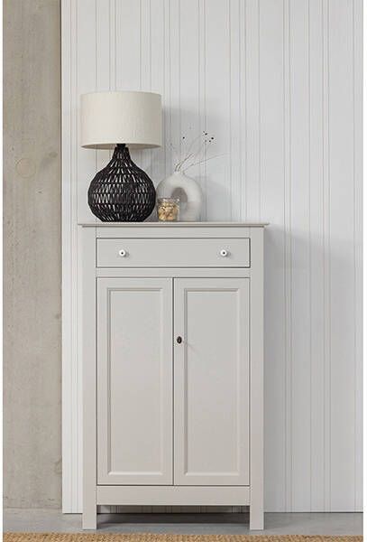 WOOOD Meidenkast Eva grenen mist./h3#De eenvoudig brocante kast die niet mag ontbreken in een (kinder)kamer met landelijke stijl is deze Eva meidenkast. Eva is onderdeel van de WOOOD collectie en is een opvallend item door het gladgeschuurde grenenhout en matte coating. Achter de deuren en ladefront gaat een zee van opbergruimte schuil, perfect voor kleding, beddengoed of papierwerk.WAARSCHUWING kantelgevaar!Voor kasten hoger dan 70 cm raden we aan om extra aandacht te besteden aan de muurbevestiging. De montage van de valpreventie voorkomt ongelukken en behoudt de kast voor kantelen.MateriaalDe grenenhouten meubelen uit onze collecties zijn FSC-gecertificeerd en worden op diverse manieren behandeld. Zo is geschuurd grenen zeer glad en netjes en staat geborsteld grenen juist bekend om zijn karakteristieke nerftekeningen en doorleefde uitstraling. Voor een nog robuustere look wordt het grenenhout band gezaagd. Grenenhout wordt gekenmerkt door een lichtgele kleur en zichtbare vlamtekeningen.AfmetingenDe Eva meidenkast heeft een hoogte van 150 cm, breedte van 93 cm en een diepte van 40 cm. De binnenzijde beschikt over drie legplanken, vervaardigd uit spaanplaat met een melaninelaag, over de gehele breedte van de kast. De achterwand van de kast is vervaardigd uit MDF en zorgt voor de stevigheid van kast. Elke legplank en de lade heeft een draagkracht van 15 kg wanneer gelijkmatig verdeeld.OnderhoudOnbehandeld grenenhout heeft een relatief korte levensduur, gemiddeld 5-10 jaar. Om deze reden behandelen wij onze grenenhouten meubelen om de levensduur aanzienlijk te verlengen. Behandeld grenenhout is eenvoudig schoon te houden met een lichtvochtige doek. Om kringen en plekken in het hout te vermijden is het aangeraden om vochtige vlekken direct te drogen.WOOOD Opbergkast 'Eva' 150 x 93cm, kleur Mist./h3#WOOOD Opbergkast Eva
