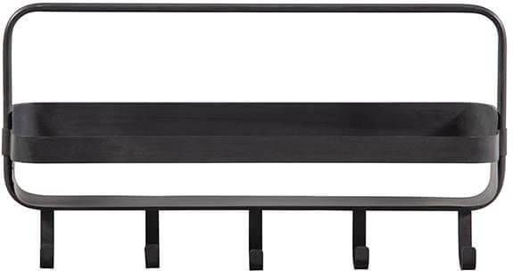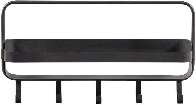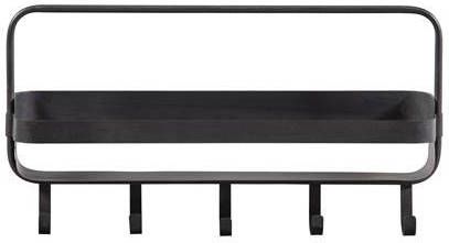 Handig opbergrek met haakjes Vervaardigd uit metaal met zwarte poedercoating Eenvoudig op te hangen H 29 x B 56 x D 13 cm Dit leuke wandrek met een strak design komt uit de collectie van het Nederlandse merk WOOOD. Het metalen frame heeft een matzwarte poedercoating met een vintage uitstraling. Het design is mooi smal, perfect voor meerdere stoere woonstijlen. Het Akke wandrek heeft een smal plankje, handig voor bijvoorbeeld sjaals en mutsen in de hal of hand- en theedoeken in de keuken. De vijf ophanghaakjes zijn zeer praktisch en kunnen maar liefst 5 KG per haakje dragen. Het Akke wandrek heeft een hoogte van 29 cm, een breedte van 56 cm en diepte van 13 cm. Het plankje is 53 cm breed en 8 cm diep. Op de plank heb je de ruimte (hxbxd) 21x53x13 cm tot je beschikking. De plank kan 10 KG dragen. De vijf haken onderaan hebben een hoogte van 7 cm en komen 5 cm naar voren. Aan de achterzijde van de plank zitten twee haken bevestigd waar je het wandrek aan op kan hangen aan de schroeven in de muur. Deze schroeven worden niet bijgeleverd. Het Akke wandrek weeg 1,3 KG en is ook verkrijgbaar in een verticale variant.
